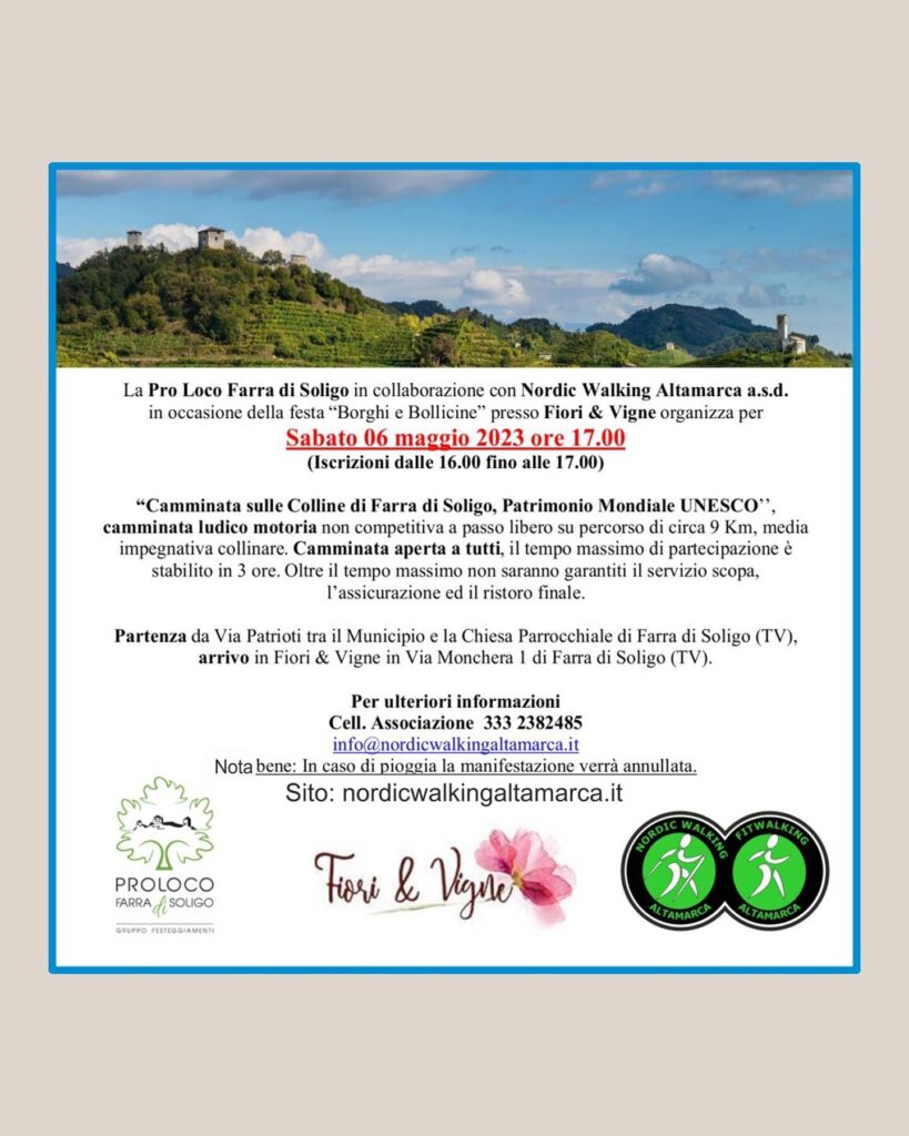 Per informazioni aggiuntive e aggiornamenti continuate a seguire le nostre pagine social e quelle della Pro Loco Farra di Soligo e della Primavera del Prosecco Superiore.