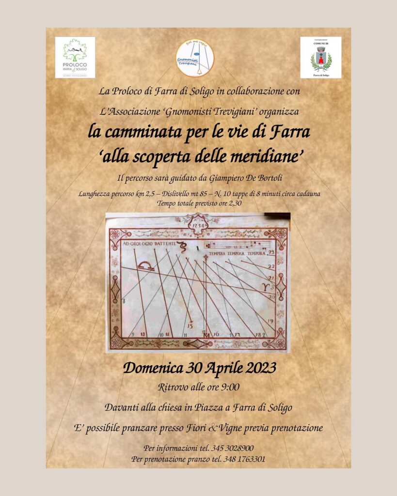 La serata ha rappresentato la prima uscita della nuovissima Associazione Gnomonisti Trevigiani, presieduta dalla professoressa Elsa Stocco ed è stata organizzata dalla Pro Loco di Farra e dall’amministrazione comunale. Un auditorium gremito, ha ascoltato le autorità presenti ma soprattutto lo gnomonista Gianpiero De Bortoli che sarà la guida di questa passeggiata tra le 51 meridiane del comune di Farra di Soligo (su 1.127 orologi solari censiti nella provincia di Treviso, Farra è al terzo posto dopo Valdobbiadene e Treviso).