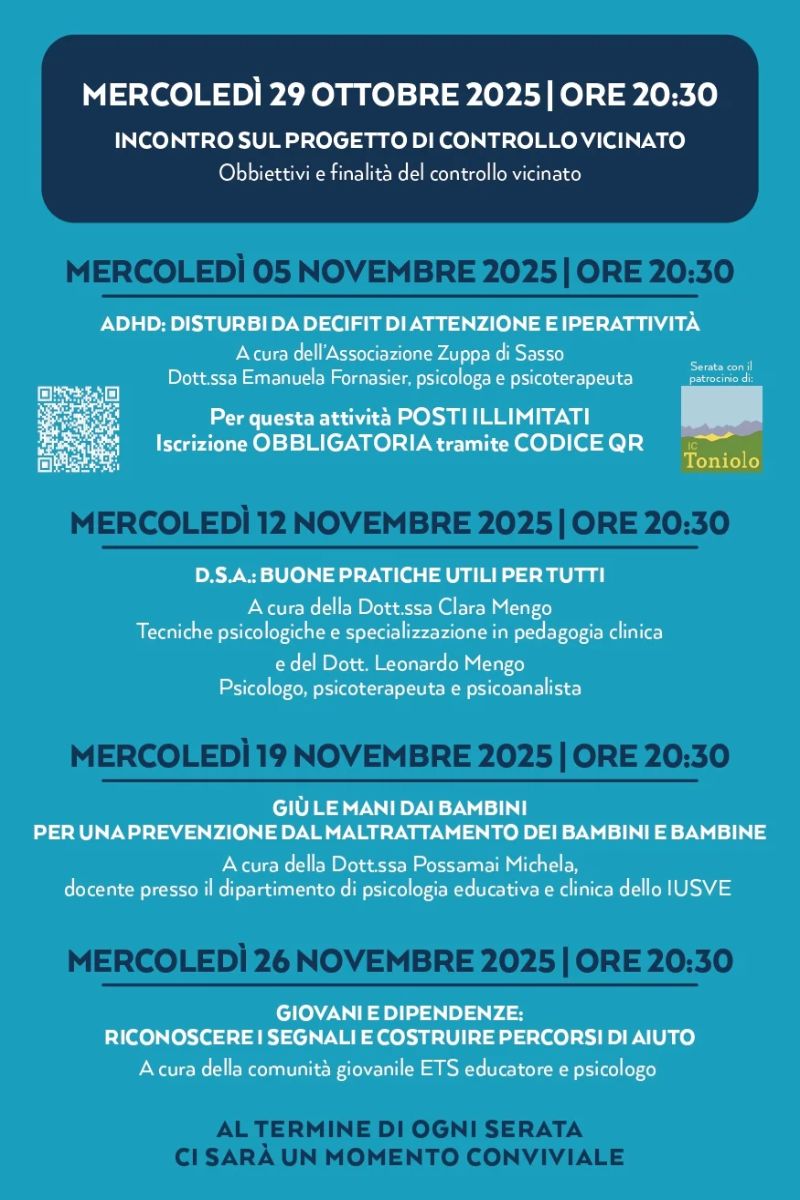 05/11/2025 ore 20:30 "ADHD: Disturbi da deficit di attenzione e iperattività" con la partecipazione dell'Associazione "Zuppa di Sasso" e la dott.ssa Emanuela Fornasier, psicologa e psicoterapeuta;