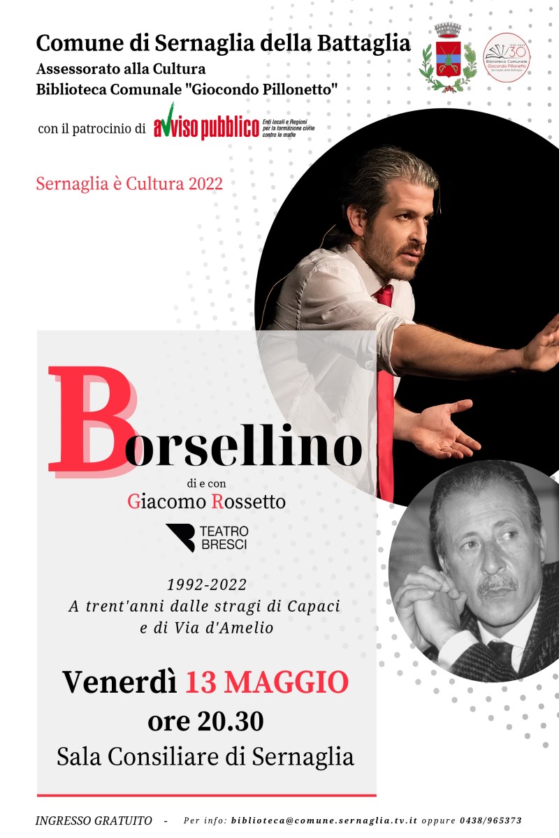 A trent'anni dalle stragi di Capaci e Via D'Amelio l'Amministrazione Comunale e la Biblioteca Comunale "Giocondo Pillonetto", nell'ambito del cartellone culturale Sernaglia è Cultura 2022, intendono ricordare la straordinaria personalità del magistrato Paolo Borsellino e di tutti coloro che si impegnarono nella lotta alla mafia.