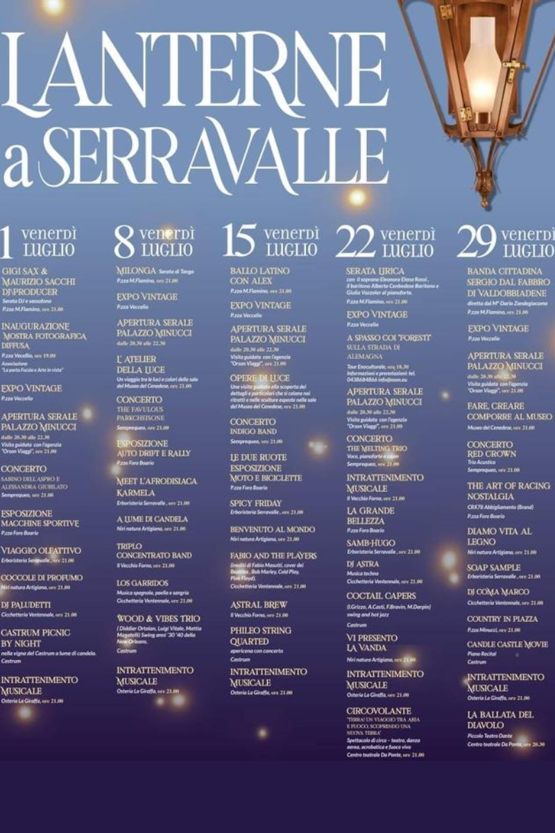 Per i quattro venerdì di luglio ritorna l'appuntamento con Lanterne a Serravalle; dal calar del sole arte...musica e spettacoli sotto i portici e nelle piazze; osterie, cocktails bar, ristoranti, negozi e botteghe storiche aperte!