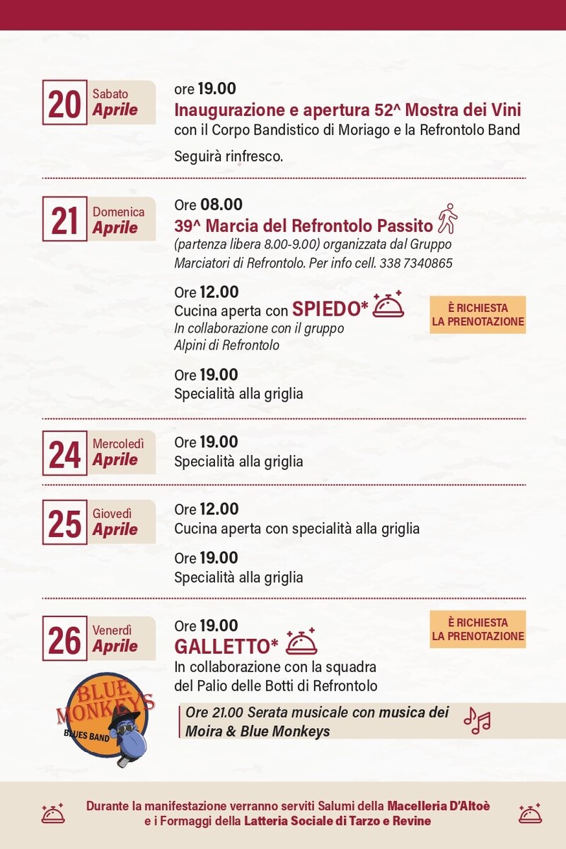 Ore 08.00 39^ Marcia del Refrontolo Passito (partenza libera 8.00-9.00) organizzata dal Gruppo Marciatori di Refrontolo. Per info cell. 338 7340865 Ore 12.00 Cucina aperta con SPIEDO* In collaborazione con il gruppo Alpini di Refrontolo