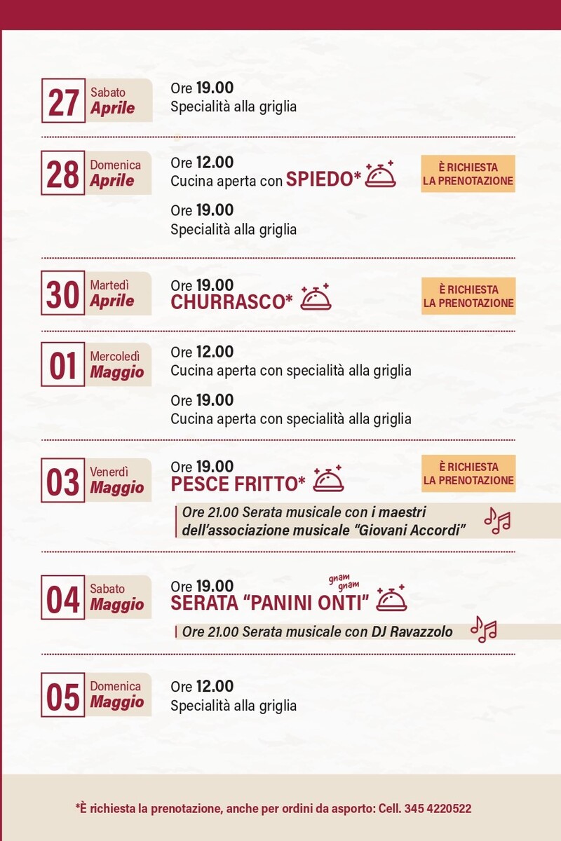 *È richiesta la prenotazione, anche per ordini da asporto: Cell. 345 4220522