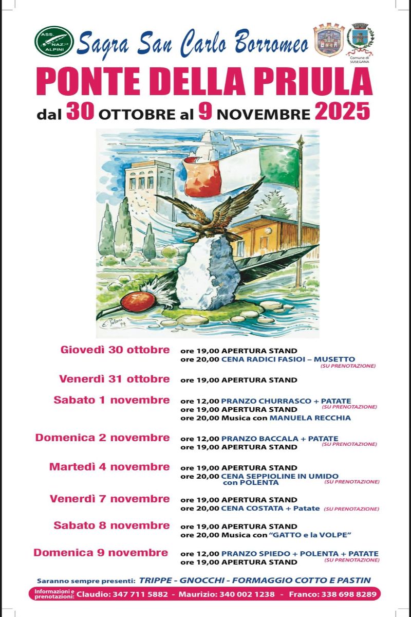 Dal 30 ottobre al 9 novembre 2025, a Ponte della Priula si terrà la tradizionale sagra di San Carlo Borromeo organizzata dal locale gruppo Alpini in collaborazione con la Pro Loco.