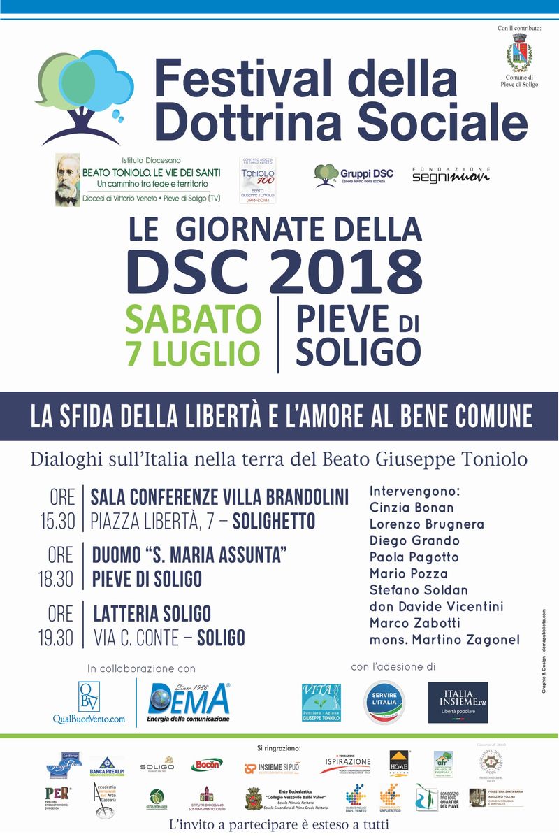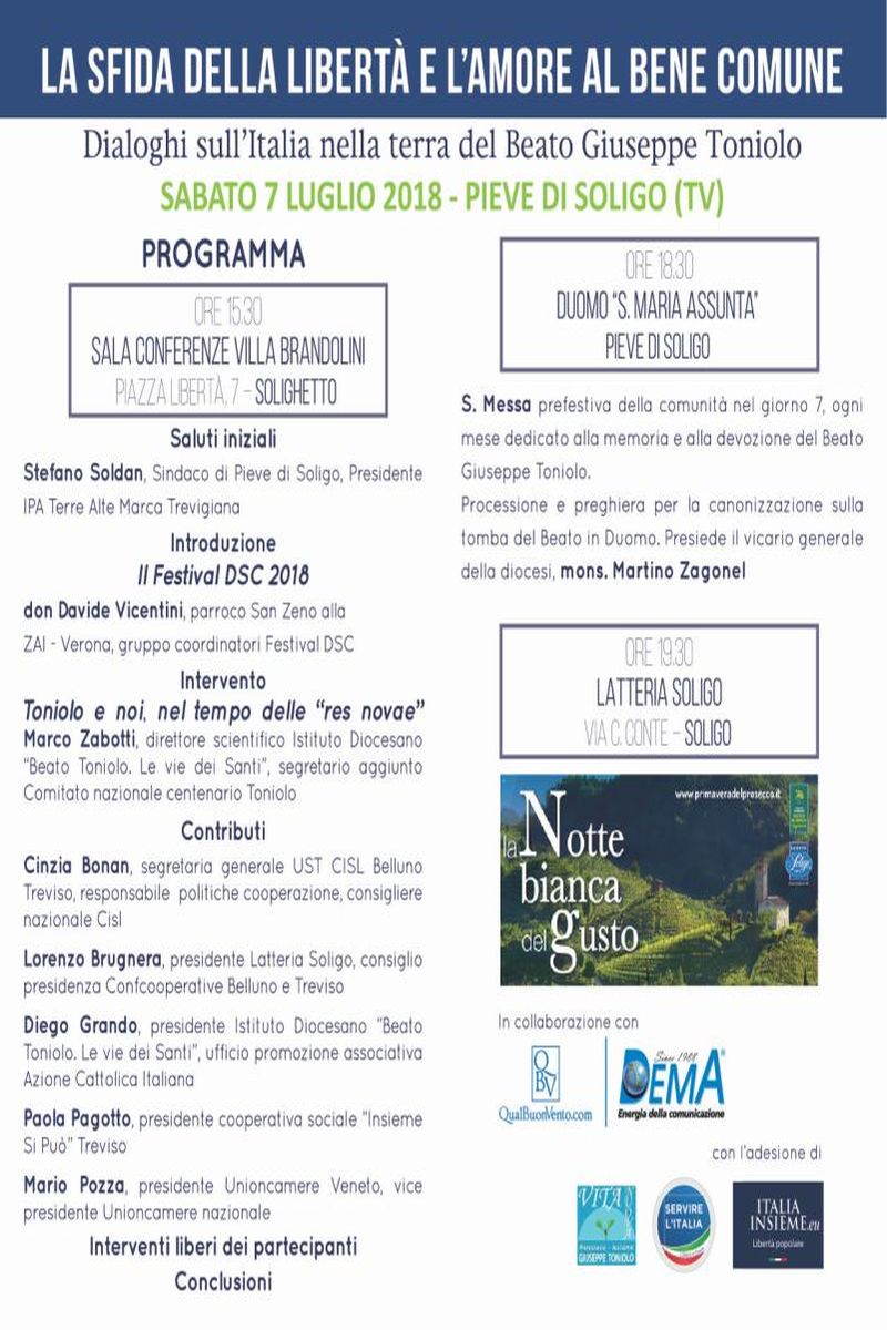 Prescelta a livello nazionale come una delle sedi dell’anteprima Festival DSC 2018, per dare espressione, valore e concretezza alla vitalità e alle proposte dei territori, Pieve di Soligo - cittadina della Marca Trevigiana che ospita nel suo Duomo le spoglie mortali del Beato Giuseppe Toniolo – vivrà la giornata di sabato 7 luglio attraverso incontri, riflessioni, celebrazioni e festa che anticipano e preparano l'evento Festival della Dottrina Sociale dal 22 al 25 novembre 2018, offrendo voce e ascolto alla vita, alle opere e ai giorni della comunità ecclesiale e civile di questo territorio in diocesi di Vittorio Veneto.